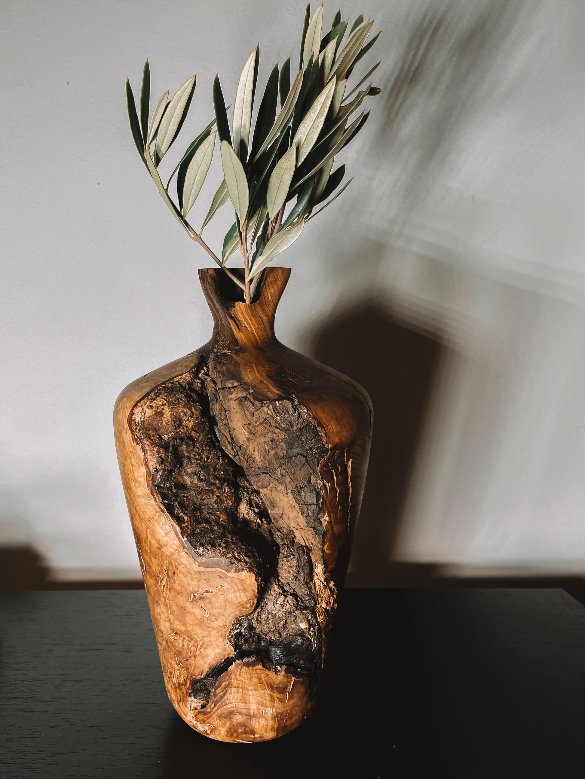 Ce vase a été tourné à la main dans un bois d’olivier massif, une essence réputée pour sa densité exceptionnelle et la complexité de ses veinures. L’olivier est l’un des bois les plus difficiles à travailler : chaque irrégularité, chaque nœud ou cavité demande une précision extrême pour révéler sa beauté naturelle.