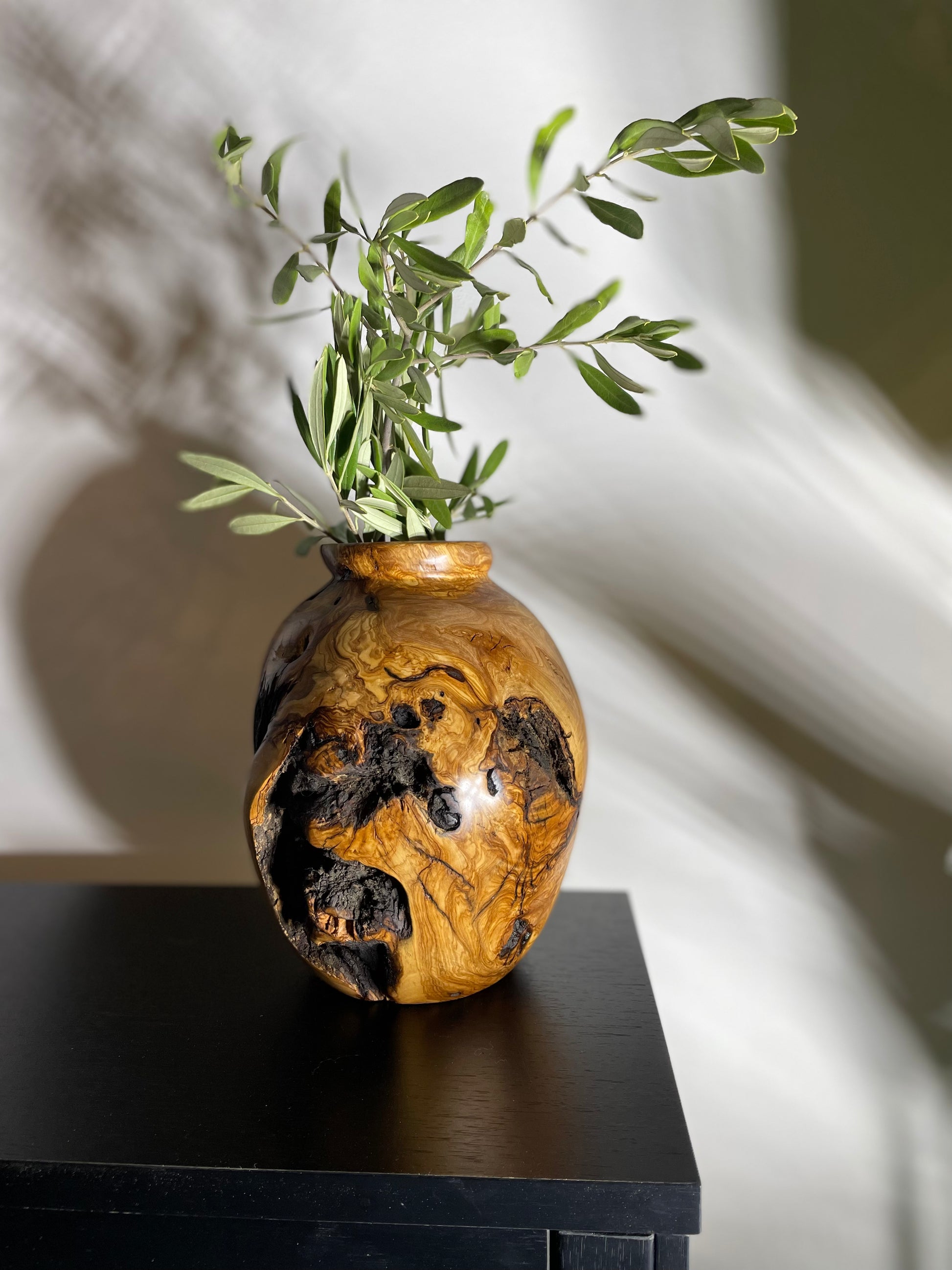 Ce vase a été entièrement tourné à la main dans un bois d’olivier massif, une essence rare et précieuse.